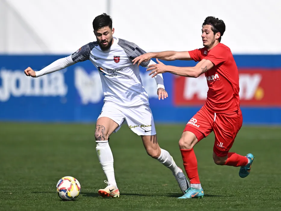 Calin Dorin Tudor si Valentin Borcea in meciul de fotbal dintre CS Tunari si CSC Selimbar, contand pentru Liga a-2-a Casa Pariurilor, desfasurat pe Terenul de iarba din cadrul Centrului National de Fotbal de la Buftea, sambata 9 martie 2024. © FOTO:Razvan Pasarica/SPORT PICTURES