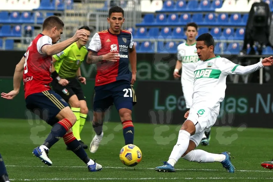 Cagliari's Razvan Marin (L) and Sassuolo's Rogerio (R) in action during the Italian Serie A soccer match between Cagliari Calcio and US Sassuolo Calcio at Sardegna Arena stadium in Cagliari, Sardinia island, Italy, 31 January 2021. EPA-EFE/,Image: 587564439, License: Rights-managed, Restrictions: , Model Release: no