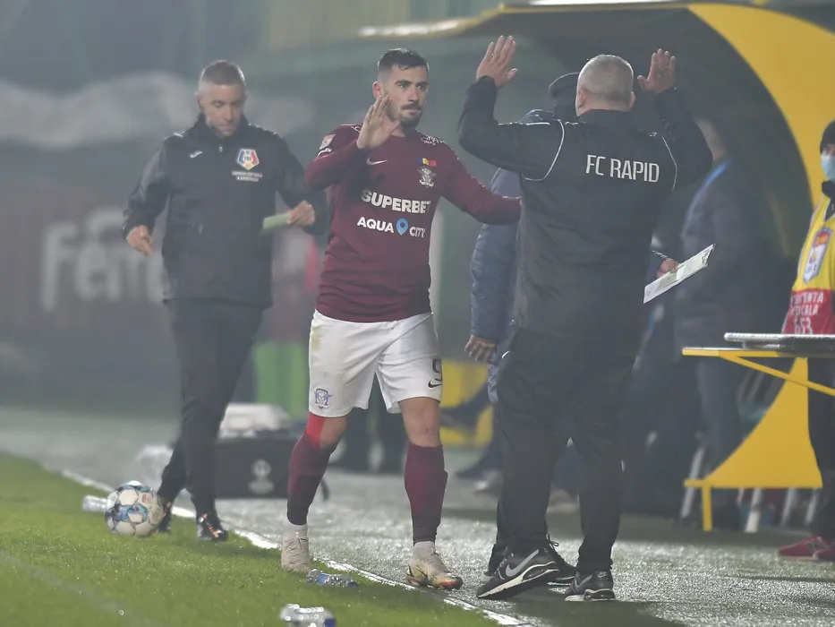 Adrian Ionut Balan este felicitat de catre Mihai Iosif in meciul de fotbal dintre Rapid Bucuresti si CFR Cluj, contand pentru Liga 1 Casa Pariurilor, desfasurat pe Stadionul Orasenesc din Mioveni, duminica 17 octombrie 2021. © FOTO:Razvan Pasarica/SPORT PICTURES