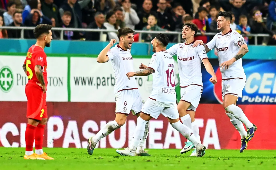 Bucurie a fotbalistilor rapidisti dupa un gol marcat cu Paul Alexandru Iacob, Sebastian Andrei Borza si Cristian Ionut Sapunaru in meciul de fotbal dintre FCSB si Rapid Bucuresti, din cadrul Superligii Superbet, desfasurat pe Arena Nationala din Bucuresti, duminica 5 noiembrie 2023. © FOTO:Razvan Pasarica/SPORT PICTURES