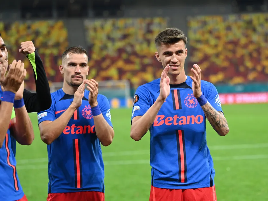Fotbaliștii steliști Darius Dumitru Olaru si Octavian George Popescu salută galeria după meciul dintre FCSB si RFS, din cadrul UEFA Europa League, desfasurat pe Arena Nationala din Bucuresti, joi 26 septembrie 2024. © FOTO:Razvan Pasarica/SPORT PICTURES