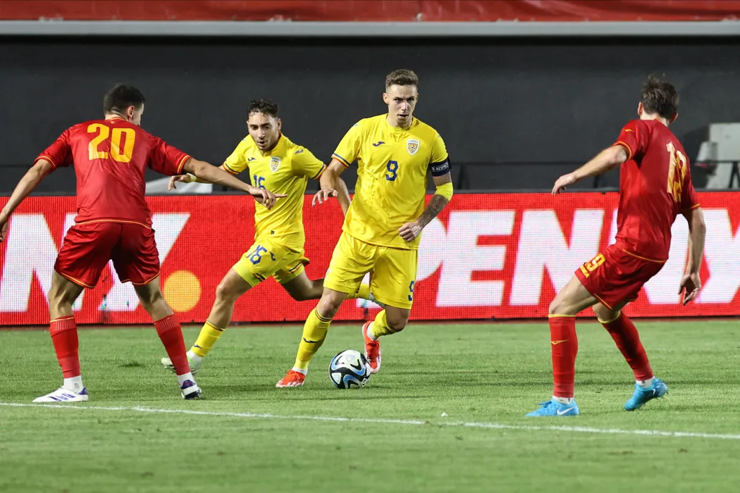 Louis Munteanu și Andrei Ahmed Mustafa Bani în meciul de fotbal dintre România U21 și Muntenegru U21, contând pentru Campionatul European U21 EURO 2025, desfășurat pe Stadionul Eugen Popescu din Târgoviște,vineri 6 septembrie 2024. © FOTO: Gică FLUȘTER/SPORT PICTURES