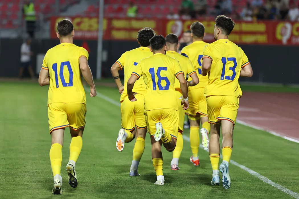 Fotbaliștii români se bucură după un gol marcat în meciul de fotbal dintre România U21 și Muntenegru U21, contând pentru Campionatul European U21 EURO 2025, desfășurat pe Stadionul Eugen Popescu din Târgoviște,vineri 6 septembrie 2024. © FOTO: Gică FLUȘTER/SPORT PICTURES