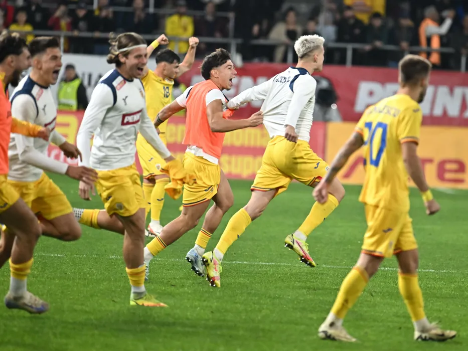 Bucurie a fotbalistilor romani Costin Amzar si Octavian Popescu dupa meciul de fotbal dintre Romania U21 si Elvetia U21, contand pentru Preliminariile UEFA EURO 2025, desfasurat pe Superbet Arena Giulesti din Bucuresti, marti 15 octombrie 2024. © FOTO:Razvan Pasarica/SPORT PICTURES