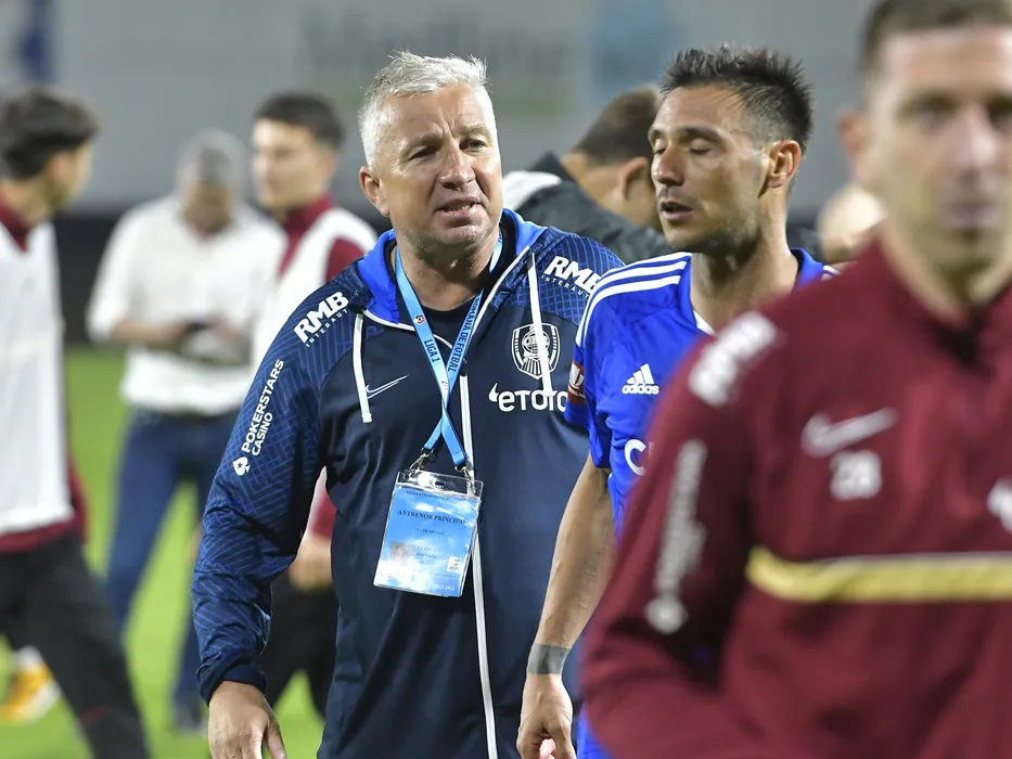 Dan Petrescu discuta cu Mario Camora dupa meciul de fotbal dintre CFR Cluj si FC U Craiova, barajul din cadrul Superligii Superbet pentru UEFA Conference League, desfasurat pe Stadionul Dr. Constantin Radulescu din Cluj Napoca, joi 1 iunie 2023. © FOTO:Razvan Pasarica/SPORT PICTURES
