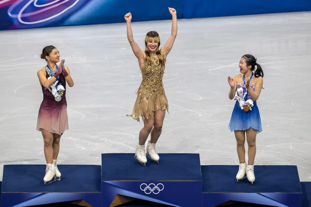 February 19, 2026, Milan, Lombardy, Italy: Team USA figure skater ALYSA LIU steps onto the podium to receive her gold medal in the Women's Figure Skating Singles Freeskating at the Milano Cortina 2026 Winter Olympics. Japan's KAORI SAKAMOTO (left) won the silver medal and Japan's AMI NAKAI (right) won the bronze.,Image: 1076639668, License: Rights-managed, Restrictions: , Model Release: no, Credit line: Mark Edward Harris / Zuma Press / Profimedia