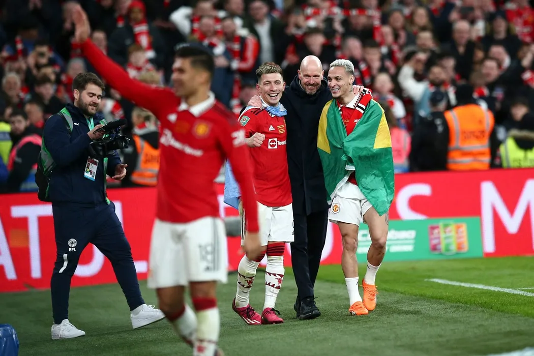 Manchester United manager Erik ten Hag, Lisandro Martinez and Antony at the end of the match