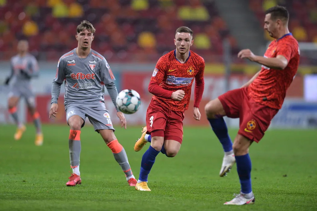 Ionut Pantiru (D), de la FCSB, lupta pentru balon cu David Miculescu (S), de la UTA Arad in meciul de fotbal din etapa a XII-a a Ligii 1, disputat pe Arena Nationala din Bucuresti, sambata, 5 decembrie 2020. EDUARD VINATORU / MEDIAFAX FOTO