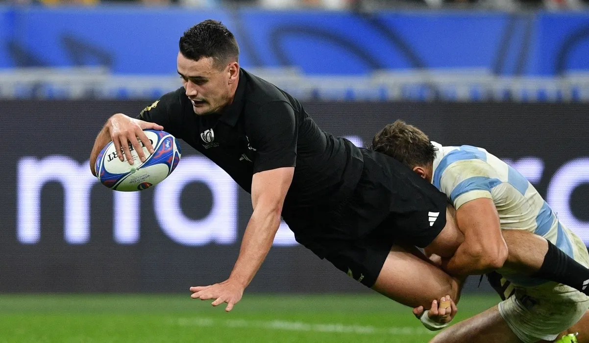 Rugby Union - 2023 Rugby World Cup - Semi-Final - Argentina vs New Zealand - Stade de France, Saint-Denis - Friday 20th October 2023 New Zealand's Will Jordan scores his sides seventh try and his hat trick. COLORSPORT / Ashley Western