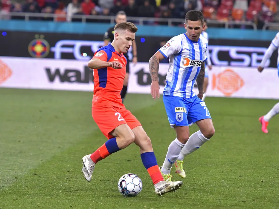 Darius Dumitru Olaru si Ovidiu Alexandru Bic in meciul de fotbal dintre FCSB si Universitatea Craiova, contand pentru Play-off-ul Ligii 1 Casa Pariurilor, desfasurat pe Arena Nationala din Bucuresti, duminica 3 aprilie 2022. © FOTO:Razvan Pasarica/SPORT PICTURES