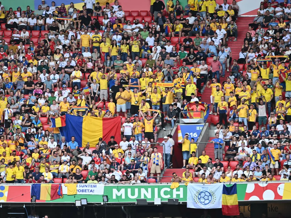 Suporterii romani cu steaguri si esarfe tricolore in tribuna la meciul dintre Romania si Ucraina, din cadrul UEFA EURO 2024, desfasurat pe Fussball Arena din Munchen, luni 17 iunie 2024. © FOTO:Razvan Pasarica/SPORT PICTURES