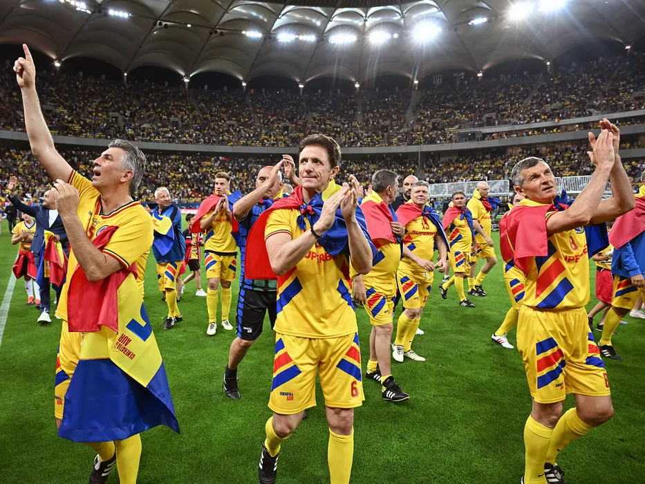 Ionut Lupescu, Gheorghe Popescu si Ovidiu Ioan Sabau saluta publicul dupa meciul amical de fotbal dintre Romania Generatia de Aur si Legendele Lumii, desfasurat pe Arena Nationala din Bucuresti, sambata 25 mai 2024. © FOTO:Razvan Pasarica/SPORT PICTURES