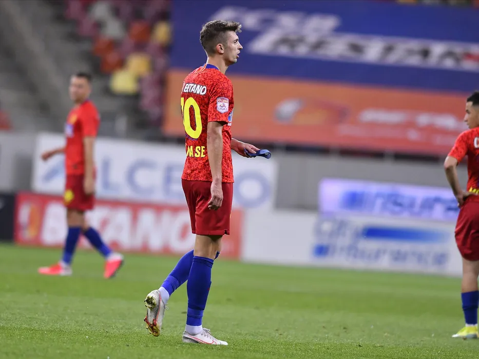 Florin Tanase preda banderola de capitan dupa ce a fost eliminat in meciul de fotbal dintre FCSB si Gaz Metan Medias, contand pentru play-off-ul Ligii 1 Casa Pariurilor, disputat fara spectatori pe Arena Nationala din Bucuresti, duminica 21 iunie 2020. © FOTO:Razvan Pasarica/SPORT PICTURES
