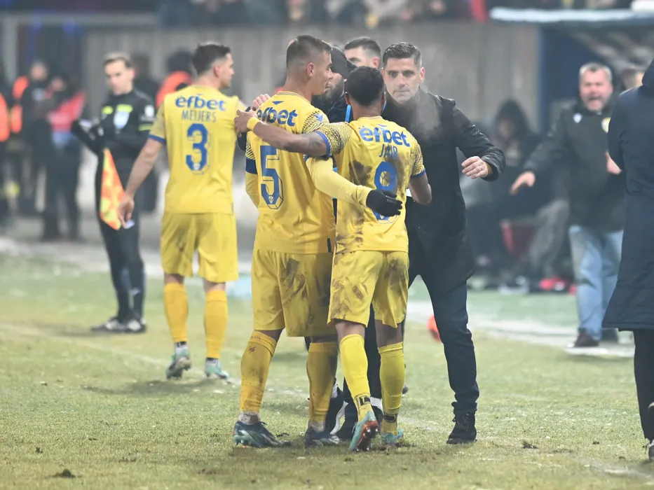 Valentin Constantin Țicu si Florin Cristian Parvu se bucură dupa un gol marcat de catre Jair Silva Tavares în meciul de fotbal dintre Petrolul Ploiesti si Dinamo Bucuresti, contând pentru Superliga Superbet, desfășurat pe Stadionul Ilie Oana din Ploiesti, sambata 20 ianuarie 2024. © FOTO: Răzvan PĂSĂRICĂ/SPORT PICTURES