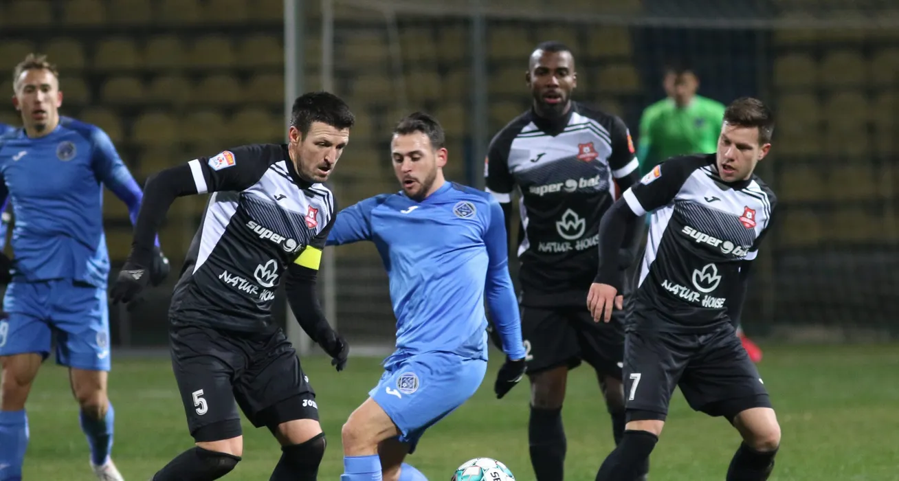 Razvan Adrian Dalbea, Romario Santos Pires, Mihai Dobrescu si Ionut Petrisor Petrescu in meciul de fotbal dintre Academica Clinceni si FC Hermannstadt, contand pentru Liga 1 Casa Pariurilor, desfasurat pe Stadionul Municipal Ion Comsa din Calarasi, duminica 17 ianuarie 2021. © FOTO:Gheorghe Fluster/SPORT PICTURES