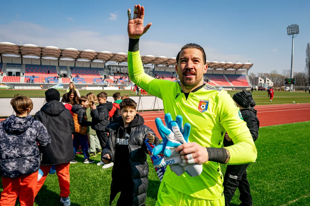 Iustin Alin Popescu salută galeria la finalul meciuluide fotbal dintre Chindia Târgoviște și CSM Alexandria, contând pentru Liga 2 Casa Pariurilor, desfășurat pe Stadionul Eugen Popescu din Târgoviște, sâmbătă 9 martie 2024. © FOTO: Marius TUDOR/SPORT PICTURES