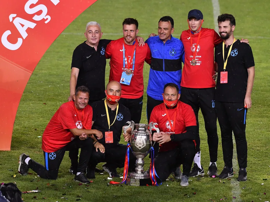 Mihai Pintilii, Toni Petrea, Ovidiu Petre,Thomas Neubert, Catalin Fainisi si Marius Popa se bucura la o fotografie de grup alaturi de trofeu dupa castigarea Cupei Romaniei in urma meciului de fotbal impotriva celor de la Sepsi OSK Sfantu Gheorghe, disputat fara spectatori pe Stadionul Ilie Oana din Ploiesti, miercuri 22 iulie 2020. © FOTO:Razvan Pasarica/SPORT PICTURES