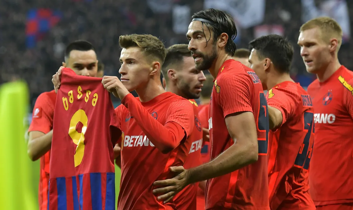 Bucurie a fotbalistilor stelisti dupa un gol marcat cu Octavian George Popescu si Andrea Compagno in meciul de fotbal dintre FCSB si Rapid Bucuresti, contand pentru Superliga Superbet, desfasurat pe Arena Nationala din Bucuresti, duminica 6 noiembrie 2022. © FOTO:Razvan Pasarica/SPORT PICTURES