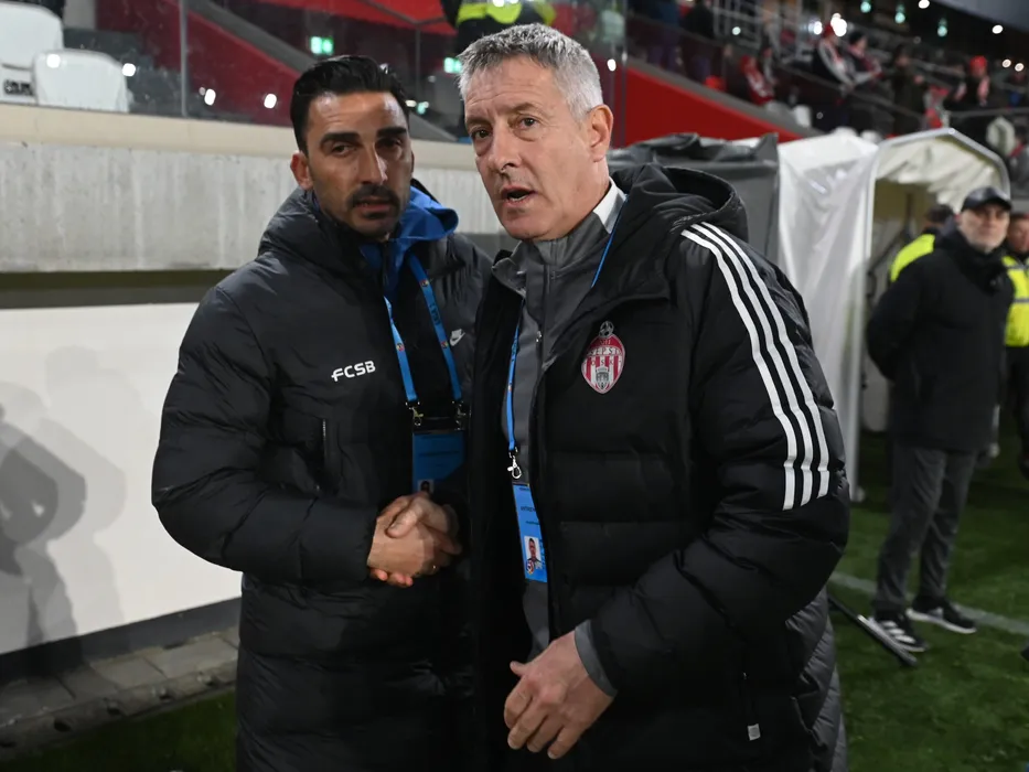 Cei doi antrenori Cristiano Bergodi si Elias Charalambous se saluta inaintea meciului de fotbal dintre Sepsi OSK Sfantu Gheorghe si FCSB, contand pentru Play-off-ul Superligii Superbet, desfasurat pe Sepsi Arena din Sfantu Gheorghe, luni 3 aprilie 2023. © FOTO:Razvan Pasarica/SPORT PICTURES