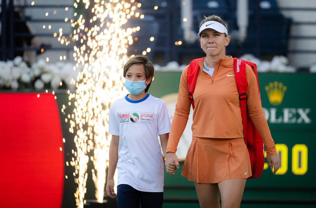 DUBAI, UNITED ARAB EMIRATES - FEBRUARY 18: Simona Halep of Romania walks onto the court before playing her semi-final match against Jelena Ostapenko of Latvia at the Dubai Duty Free Tennis at Dubai Duty Free Tennis Stadium on February 18, 2022 in Dubai, United Arab Emirates (Photo by Robert Prange/Getty Images)