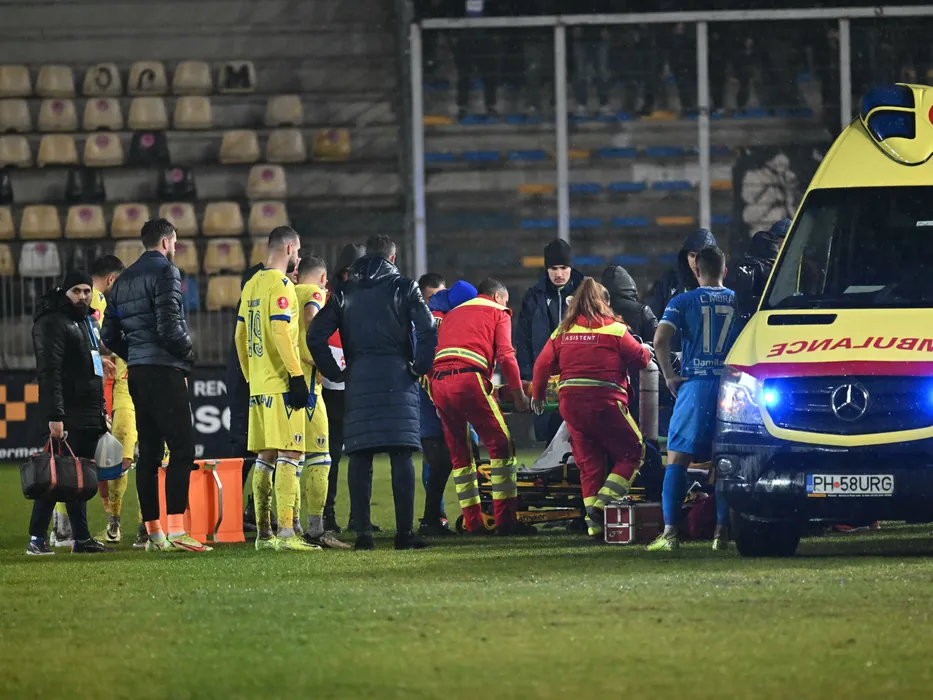 Jucatorii celor doua echipe Alexandru Tudorie si Carlos Andrei Mora Montoya reacționează la prabusirea pe teren a lui Yohan Cedric Benjamin Roche in meciul de fotbal dintre Petrolul Ploiesti si Universitatea Craiova, din cadrul Superligii Superbet desfasurat pe Stadionul Ilie Oana din Ploiesti, sambata 7 decembrie 2024. © FOTO:Razvan Pasarica/SPORT PICTURES