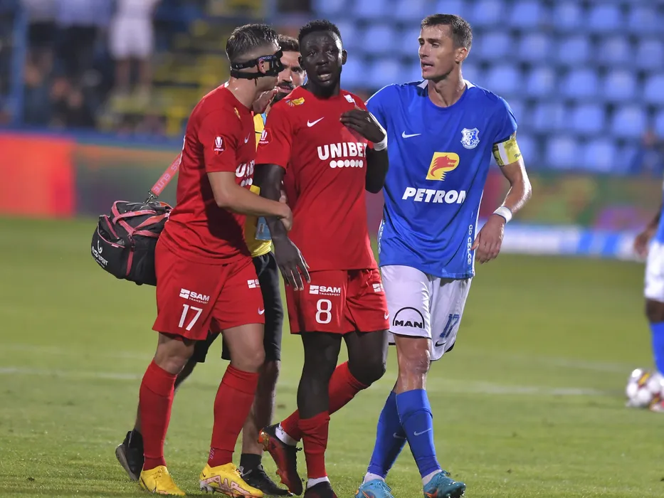 Mihai Ionut Butean, Baba Alhassan si Ionut Justinian Larie in meciul de fotbal dintre Farul Constanta si FC Hermannstadt, contand pentru Superliga Superbet, desfasurat pe Stadionul central al Academiei Gheorghe Hagi din Ovidiu, luni 15 august 2022. © FOTO:Razvan Pasarica/SPORT PICTURES