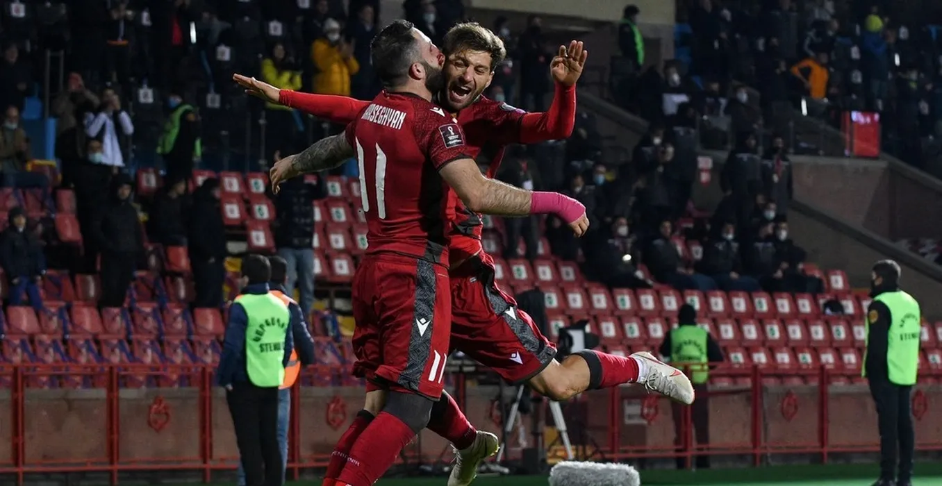 Armenia's midfielder Tigran Barseghyan celebrates with teammates after scoring a goal during the FIFA World Cup Qatar 2022 qualification football match Armenia v Iceland in Yerevan on March 28, 2021.,Image: 601863985, License: Rights-managed, Restrictions: , Model Release: no