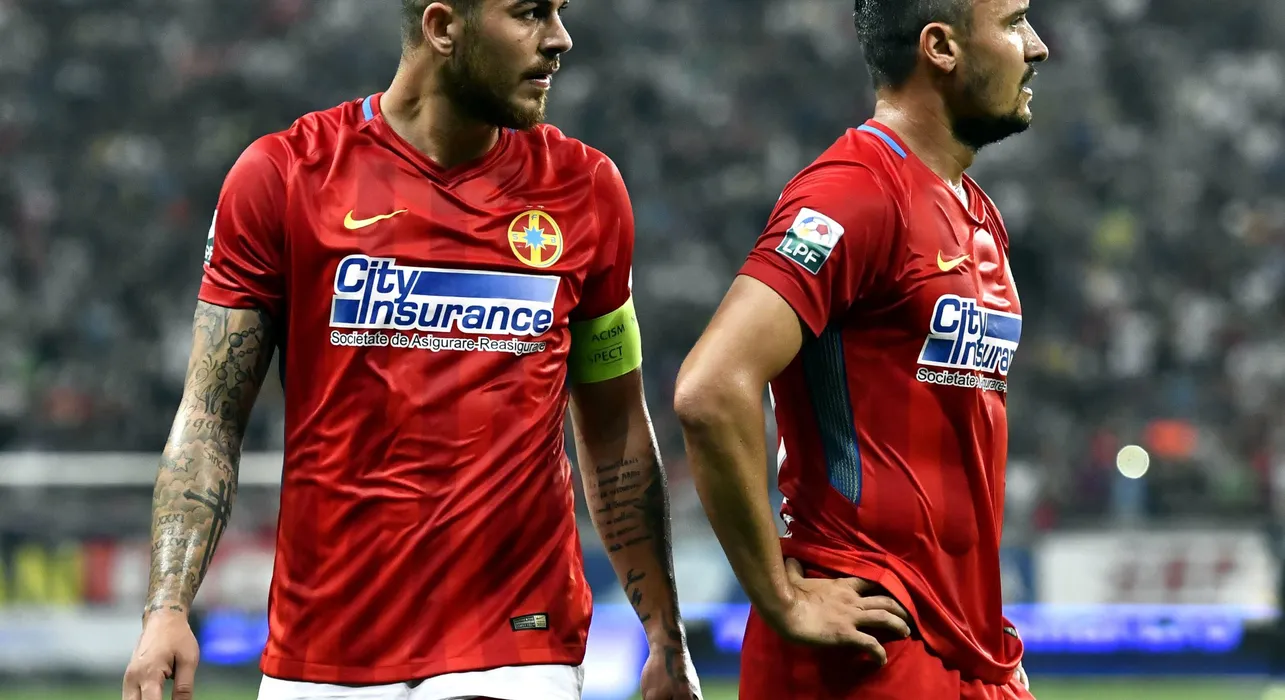 Denis Alibec si Constantin Budescu in meciul de fotbal dintre FCSB si FK Viktoria Plzen,din turul 3 preliminar al Ligii Campionilor, desfasurat marti 25 iulie 2017 pe Arena Nationala din Bucuresti.Razvan Pasarica/SPORT PICTURES