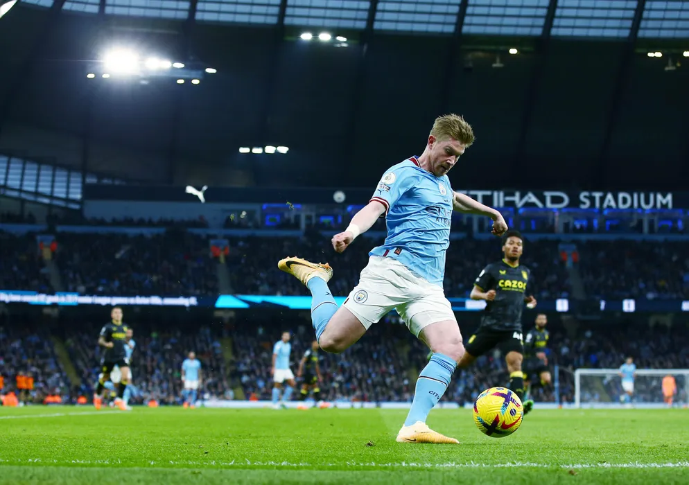 Mandatory Credit: Photo by Matt West/Shutterstock 13761812bv Kevin De Bruyne of Manchester City Manchester City v Aston Villa, Premier League, Football, Etihad Stadium, Manchester, UK - 12 Feb 2023 EDITORIAL USE ONLY No use with unauthorised audio, video, data, fixture lists, club/league logos or live services. Online in-match use limited to 120 images, no video emulation. No use in betting, games or single club/league/player publications. Manchester City v Aston Villa, Premier League, Football, Etihad Stadium, Manchester, UK - 12 Feb 2023 EDITORIAL USE ONLY No use with unauthorised audio, video, data, fixture lists, club/league logos or live services. Online in-match use limited to 120 images, no video emulation. No use in betting, games or single club/league/player publications. PUBLICATIONxINxGERxSUIxAUTxHUNxGRExMLTxCYPxROUxBULxUAExKSAxONLY Copyright: xMattxWest/Shutterstockx 13761812bv