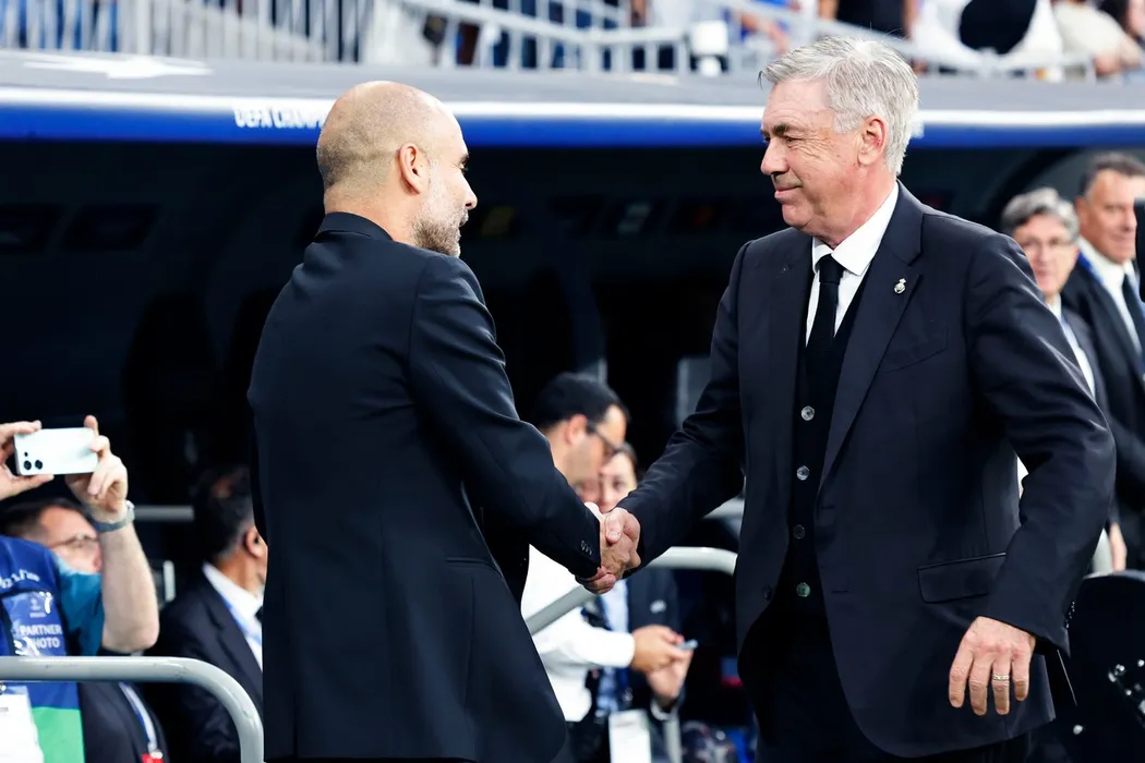 Josep Guardiola (Man.C), Carlo Ancelotti (Real), MAY 9, 2023 - Football / Soccer : UEFA Champions League semi-final 1st leg match between Real Madrid 1-1 Manchester City at Estadio Santiago Bernabeu in Madrid, Spain. (Photo by D.Nakashima/AFLO),Image: 774799142, License: Rights-managed, Restrictions: No third party sales, Model Release: no