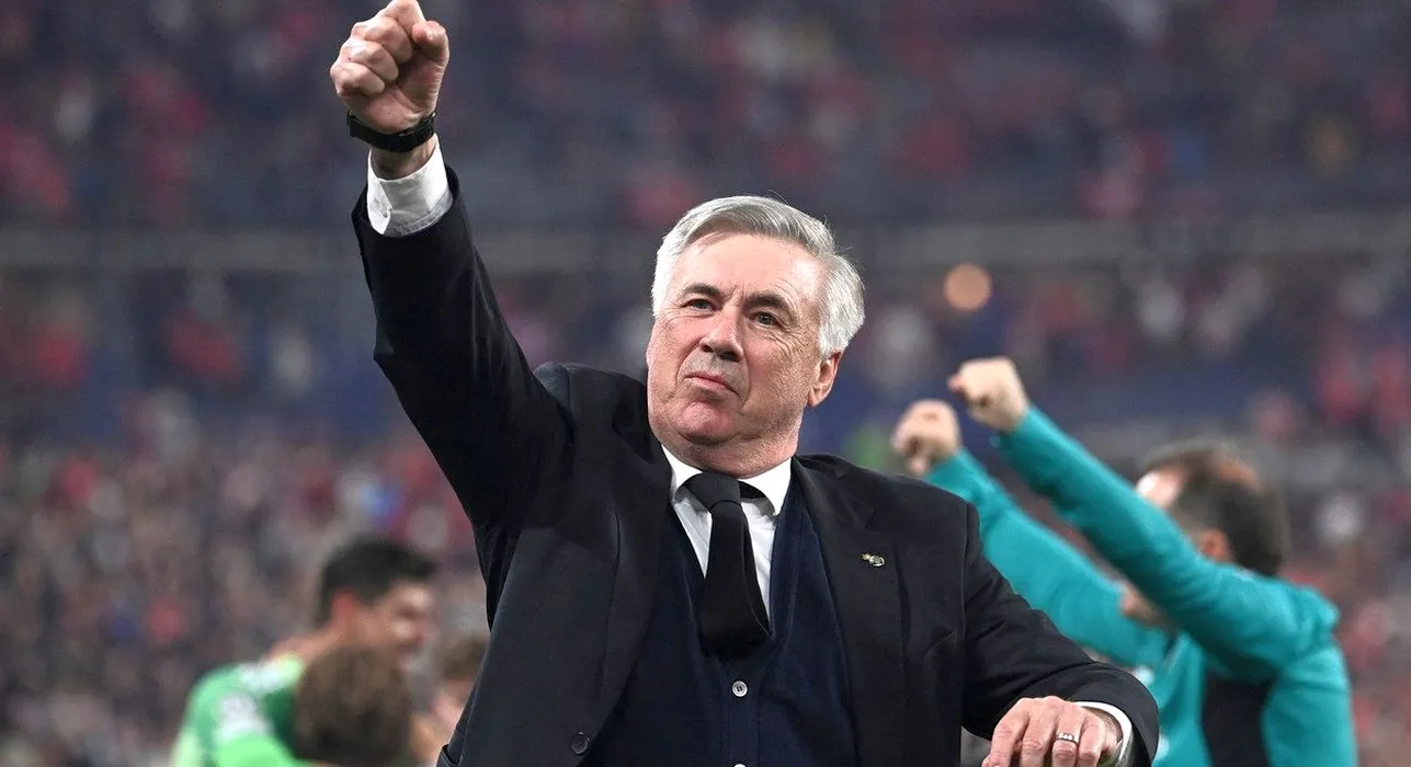 Real Madrid's Italian coach Carlo Ancelotti gestures as he celebrates his team's victory during the UEFA Champions League final football match between Liverpool and Real Madrid at the Stade de France in Saint-Denis, north of Paris, on May 28, 2022.,Image: 695330106, License: Rights-managed, Restrictions: , Model Release: no, Credit line: Profimedia