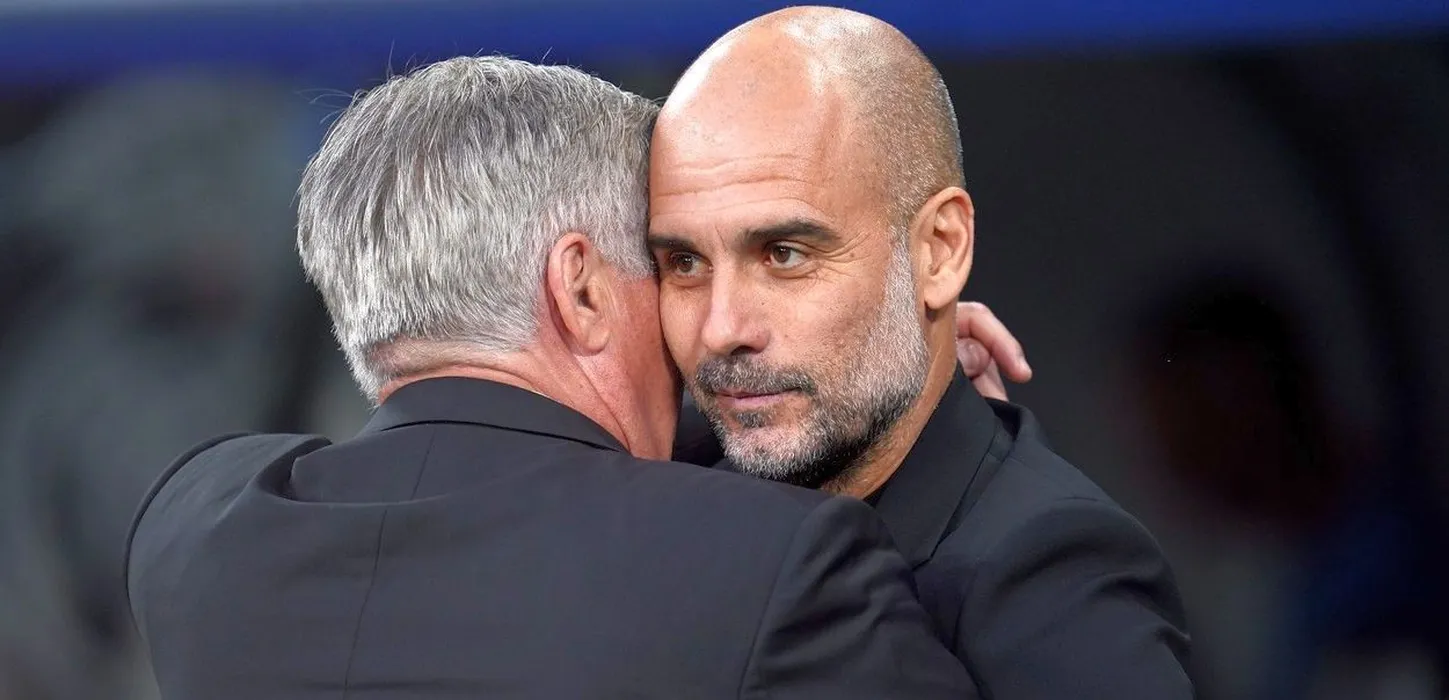 Manchester City manager Pep Guardiola (right) and Real Madrid manager Carlo Ancelotti during the UEFA Champions League, semi-final, first leg match at the Santiago Bernabeu Stadium in Madrid, Spain. Picture date: Tuesday May 9, 2023.,Image: 774751272, License: Rights-managed, Restrictions: RESTRICTIONS: Use subject to restrictions. Editorial use only, no commercial use without prior consent from rights holder., Model Release: no