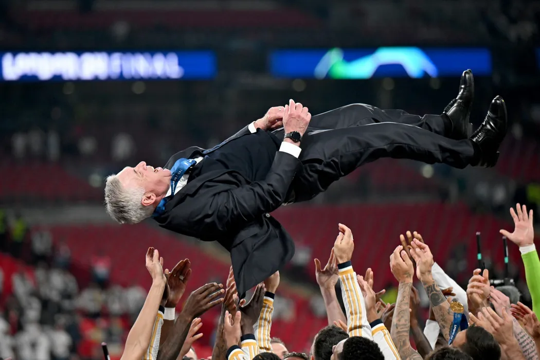 01 June 2024, United Kingdom, London: Real Madrid coach Carlo Ancelotti is thrown into the air by his players as they celebrate winning the UEFA Champions League final soccer match against Borussia Dortmund at Wembley Stadium. Photo: Robert Michael/dpa