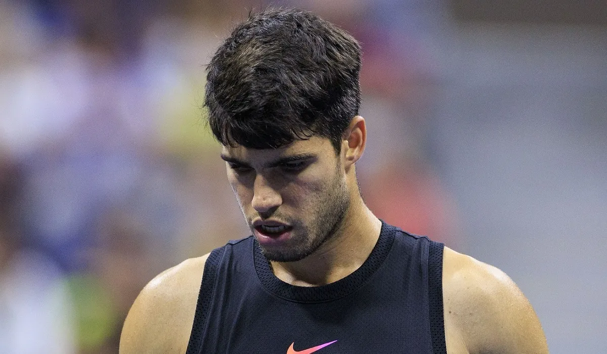 Carlos Alcaraz reacts returns to the base line on the final point of the match on Day 4 against Botic van de Zandschulp in the 2024 US Open held at the USTA Billie Jean King National Tennis Center on Thursday August 29, 2024 in the Flushing neighborhood of the Queens borough of New York City. JAVIER ROJAS/PI