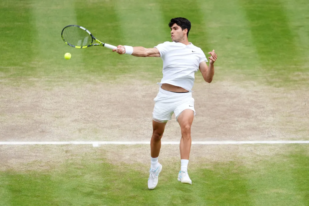 14 July 2024, United Kingdom, London: Spanish tennis player Carlos Alcaraz plays a forehand return to Serbia's Novak Djokovic during their men's singles final tennis match on day fourteen of the 2024 Wimbledon Championships at the All England Lawn Tennis and Croquet Club. Photo: John Walton/PA Wire/dpa