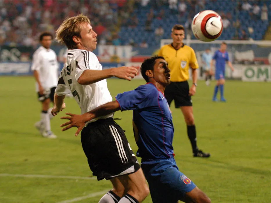 Christer Basma si Banel Nicolita in meciul de fotbal dintre Steaua Bucuresti si Rosenborg Trondheim, contand pentru Cupa UEFA, disputat pe Stadionul Ghencea-Steaua din Bucuresti, miercuri 10 august 2005. © FOTO:Razvan Pasarica/SPORT PICTURES