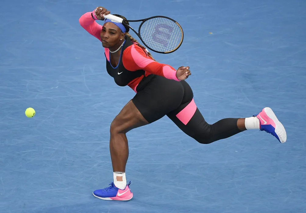 United States' Serena Williams hits a forehand return to Romania's Simona Halep during their quarterfinal match at the Australian Open tennis championship in Melbourne, Australia, Tuesday, Feb. 16, 2021.(AP Photo/Andy Brownbill)