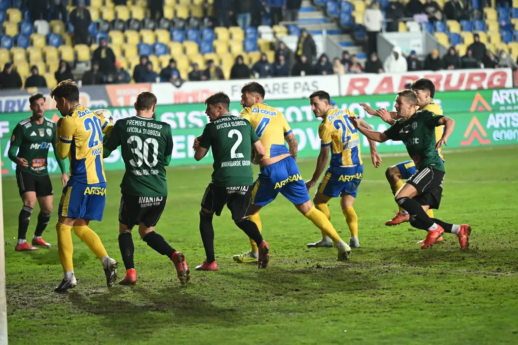 Miranda Ricardo Jose Veiga Varzim marchează un gol de langa Sergiu Catalin Hanca, Teodor Lungu, Andrei Cristian Dorobantu, Paul Papp si Oleksandr Safronov in meciul dintre Petrolul Ploiesti si Unirea Slobozia, contand pentru Superliga Superbet, desfasurat pe Stadionul Ilie Oana din Ploiesti, marti 3 februarie 2026. © FOTO:Razvan Pasarica/SPORT PICTURES