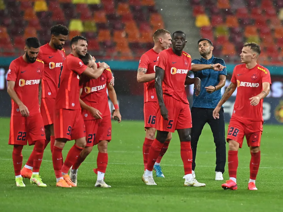 Nicolae Dica discuta cu fotbalistii stelisti Radu Stefanita Boboc, Sylas Laouari Edjouma Malcom, Andrei Ioan Cordea, Joyskim Aurelien Dawa Tchakonte, Joonas Tamm si Grigoras Alexandru Pantea dupa meciul de fotbal dintre FCSB si Chindia Targoviste, contand pentru Superliga Superbet, desfasurat pe Arena Nationala din Bucuresti, duminica 14 august 2022. © FOTO:Razvan Pasarica/SPORT PICTURES