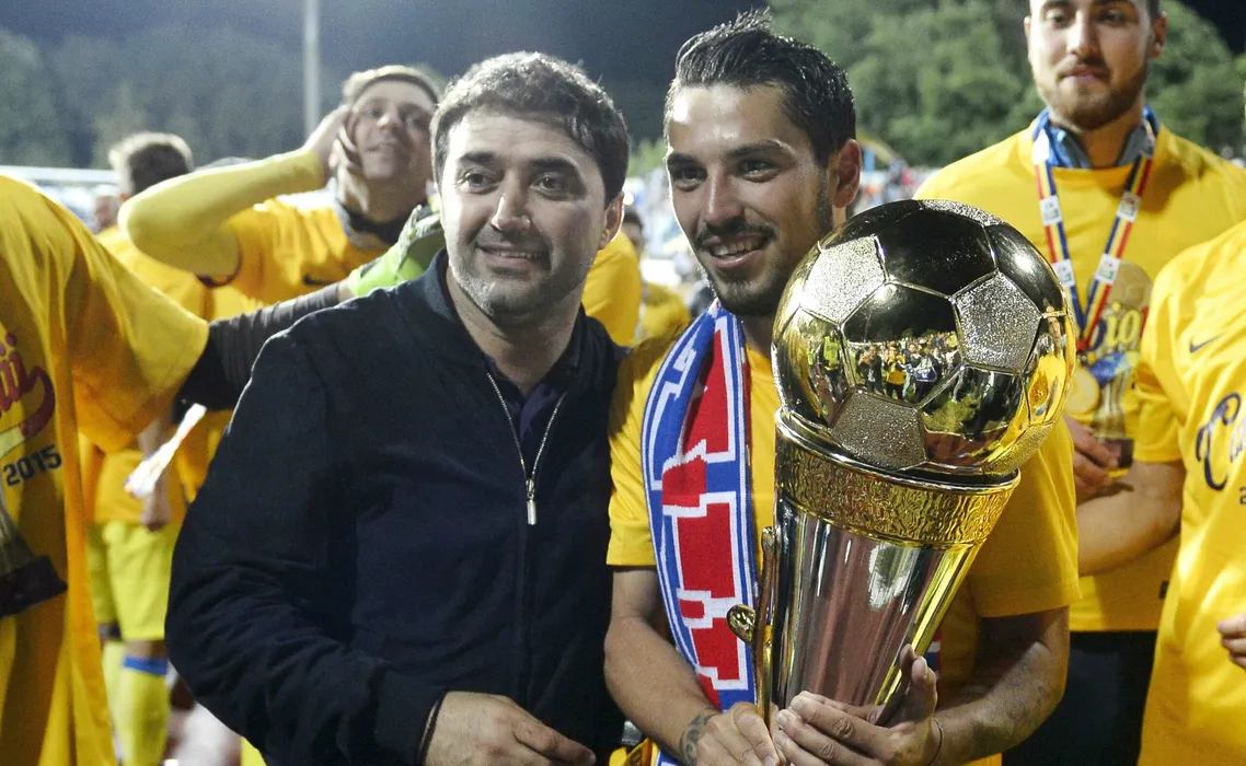 Ionut Lutu si Nicusor Stanciu pozeaza alaturi de trofeul acordat castigatoarei ligii 1