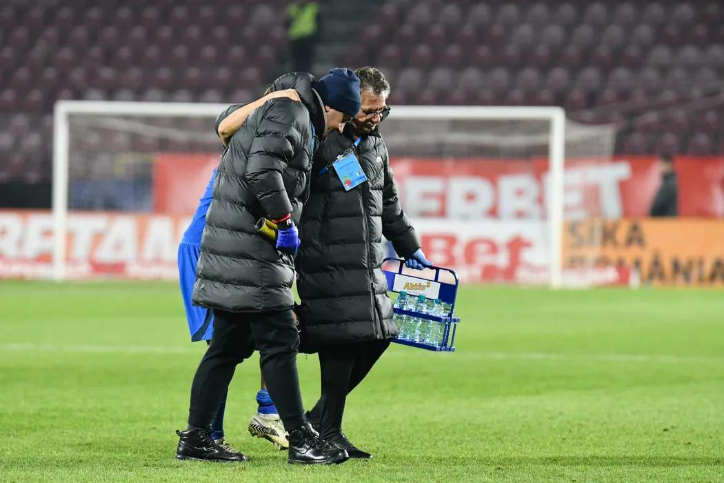 Darius Dumitru Olaru accidentat părăsește terenul încă din prima repriză în meciul de fotbal dintre FC CFR 1907 Cluj SA si FC Fotbal Club FCSB SA, contând pentru Superliga Superbet, desfășurat pe Stadionul Dr.Constantin Rădulescu din Cluj-Napoca, duminică 10 decembrie 2023. © FOTO: Flaviu BUBOI/SPORT PICTURES
