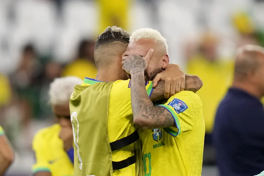 Brazil's Neymar is embraced by Brazil's Raphinha at the end of the World Cup quarterfinal soccer match between Croatia and Brazil, at the Education City Stadium in Al Rayyan, Qatar, Friday, Dec. 9, 2022. (AP Photo/Darko Bandic)