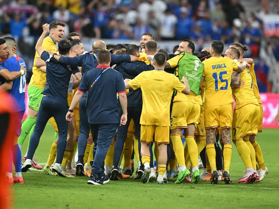 Fotbalistii romani printre care Ştefan Târnovanu si Vasile Mogoș se bucura intr-o hora pentru calificarea de pe primul loc in grupa dupa meciul de fotbal dintre Slovacia si Romania, contand pentru UEFA EURO 2024, desfasurat pe Frankfurt Arena din Frankfurt, miercuri 26 iunie 2024. © FOTO:Razvan Pasarica/SPORT PICTURES