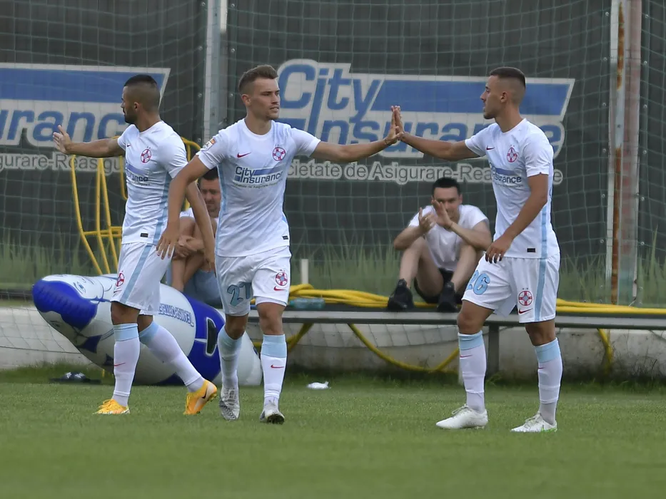 Valentin Cretu si Razvan Constantin Oaida il felicita pe Darius Dumitru Olaru dupa un gol marcat in meciul amical de fotbal dintre FCSB si Chindia Targoviste, disputat la Baza de antrenament FCSB din Bucuresti-Berceni, sambata 3 iulie 2021. © FOTO:Razvan Pasarica/SPORT PICTURES