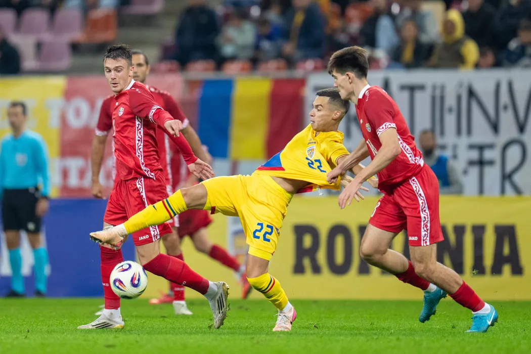 Catalin Cirjan (C), de la echipa nationala a Romaniei, lupta pentru balon cu Victor Bogaciuc (D), de la selectionata Moldovei, in amicalul de fotbal disputat pe Arena Nationala din Bucuresti, joi, 9 octombrie 2025. MARC MARASESCU / MEDIAFAX FOTO
