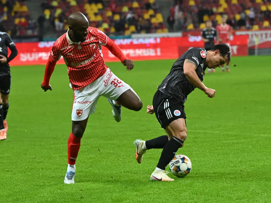 Jordan Ikoko si Holz Conrado Buchanelli in meciul de fotbal dintre Dinamo Bucuresti si Otelul Galati, din cadrul Superligii Superbet, desfasurat pe Arena Nationala din Bucuresti, sambata 29 noiembrie 2025. © FOTO:Razvan Pasarica/SPORT PICTURES