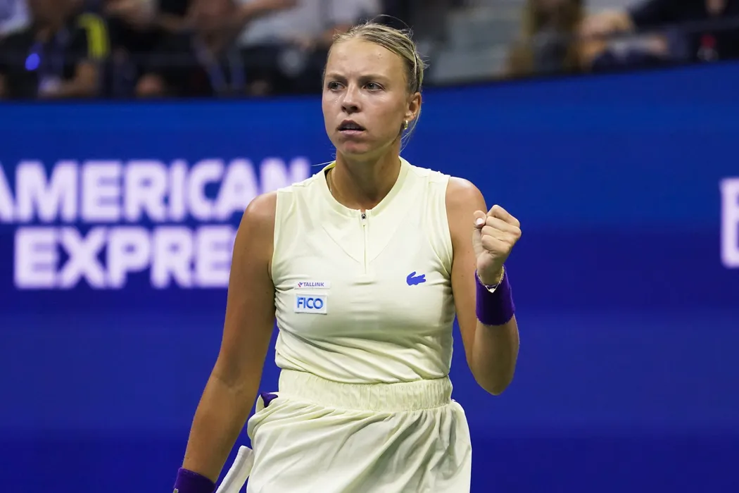 Anett Kontaveit, of Estonia, reacts during a match against Serena Williams, of the United States, at the second round of the U.S. Open tennis championships, Wednesday, Aug. 31, 2022, in New York. (AP Photo/John Minchillo)