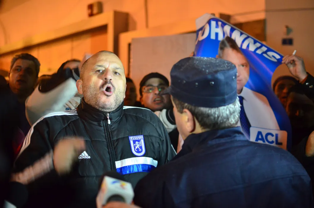 Adrian Mititelu participa la un miting, dupa anuntarea rezultatelor exit-poll-urilor la alegerile prezidentiale, in Craiova, duminica, 16 noiembrie 2014. Primele exit-poll-uri de la turul II al alegerilor prezidentiale arata ca Victor Ponta si Klaus Iohannis se afla la diferente mici unul fata de celalalt, între 48,50% si 50,90% în cazul lui Victor Ponta, si între 49,10 % si 51,50% în cazul lui Klaus Iohannis. BOGDAN DANESCU / MEDIAFAX FOTO