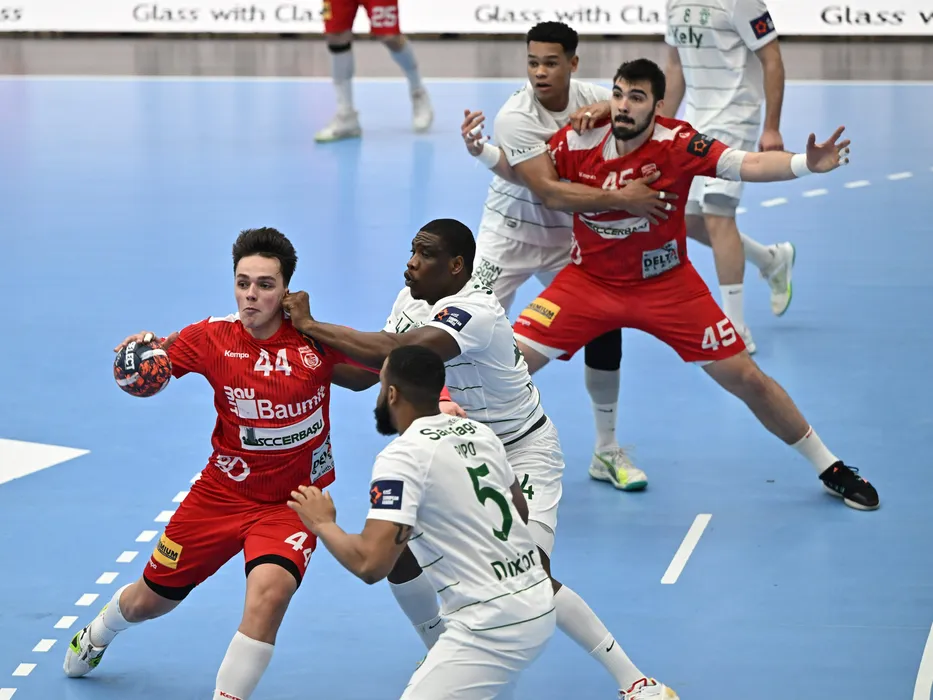 Daniel Stanciuc, Christian Yahoza Moga, Edney Silva Oliveira si Rosta Miklos in meciul de handbal masculin dintre Dinamo Bucuresti si Sporting Lisabona, din cadrul EHF European League, desfasurat in Sala Dinamo din Bucuresti, marti 5 martie 2024. © FOTO:Razvan Pasarica/SPORT PICTURES
