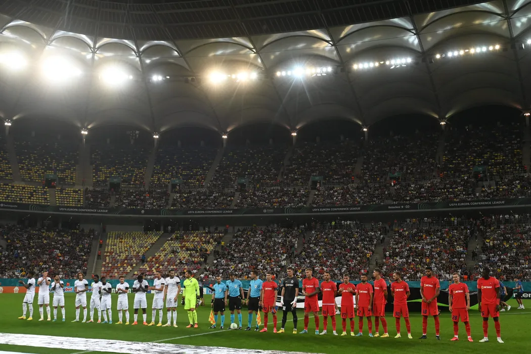 Fotbalistii celor doua echipe la startul meciului de fotbal dintre FCSB si RSC Anderlecht Bruxelles, din cadrul grupelor UEFA Europa Conference League, desfasurat pe Arena Nationala din Bucuresti, joi 15 septembrie 2022. © FOTO:Razvan Pasarica/SPORT PICTURES